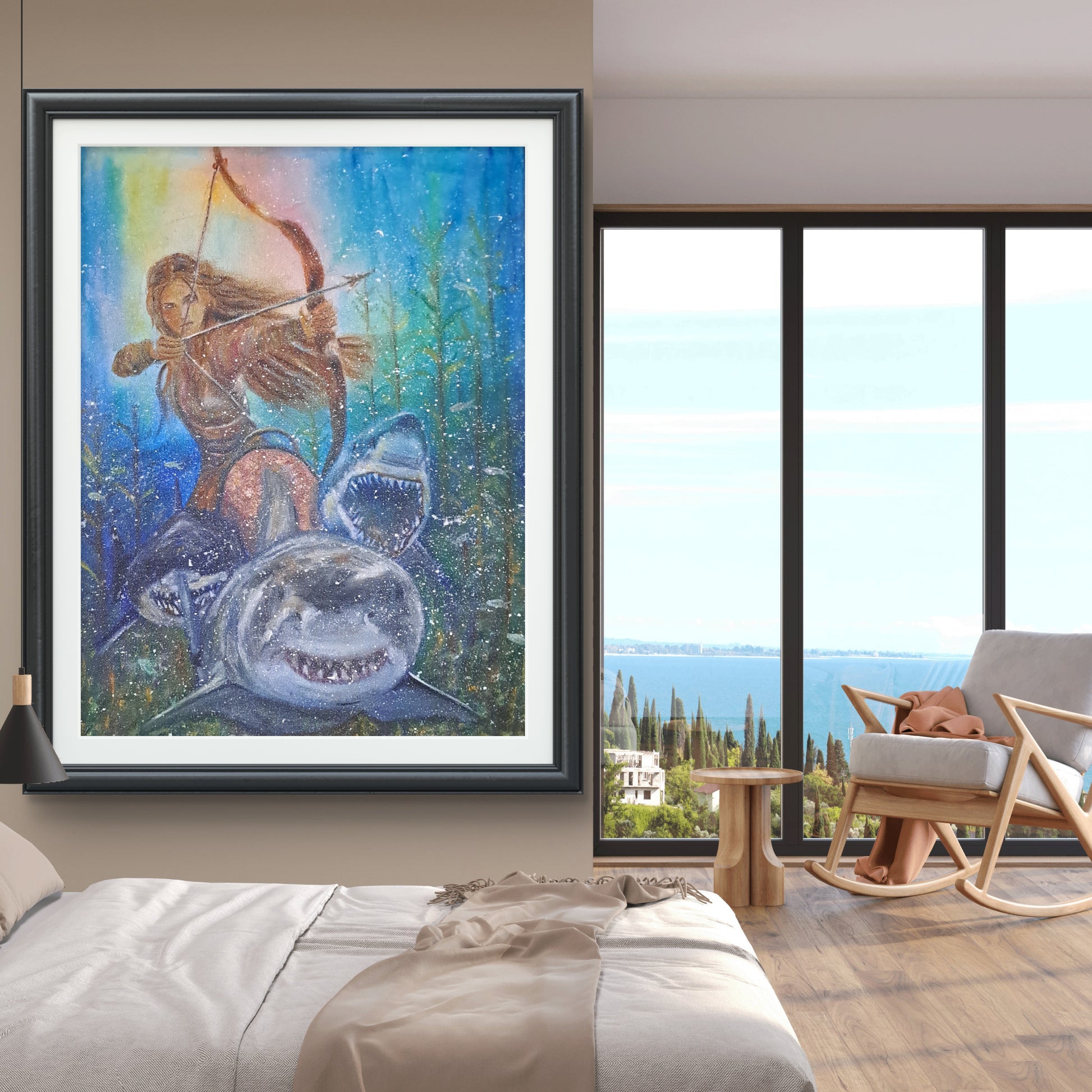 This painting is inspired by the mythological goddess Artemis. Artemis is the goddess of the hunt, the moon, and chastity.