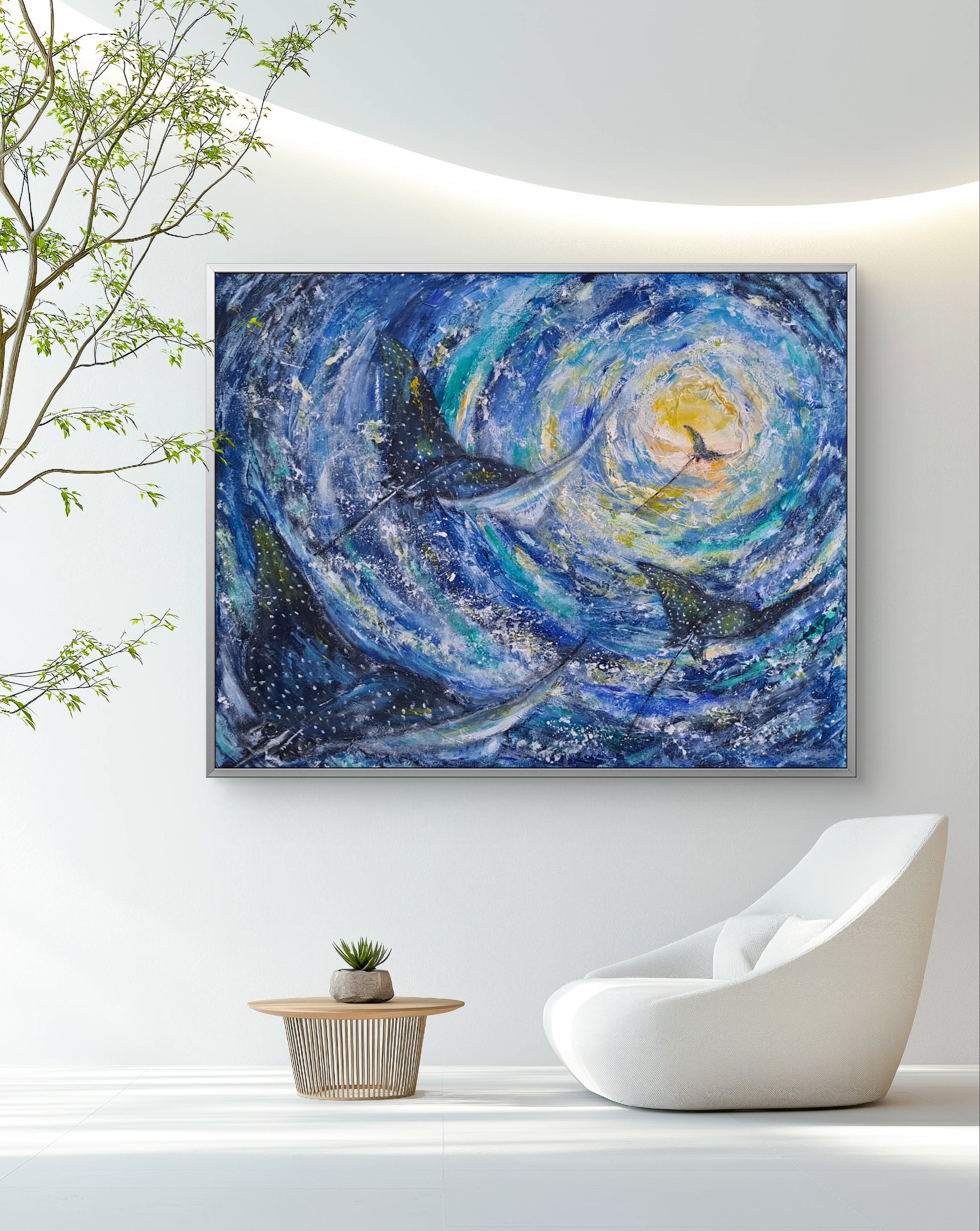 "The ocean holds moments of both calm and chaos — and in this piece, the spotted eagle ray moves gracefully through it all. I painted this to capture that quiet strength: the way the ray glides within a whirlpool’s force, never resisting, only flowing. To me, this painting symbolizes trust in life’s current — that even when the world spins around us, there’s beauty in letting go and moving with grace."