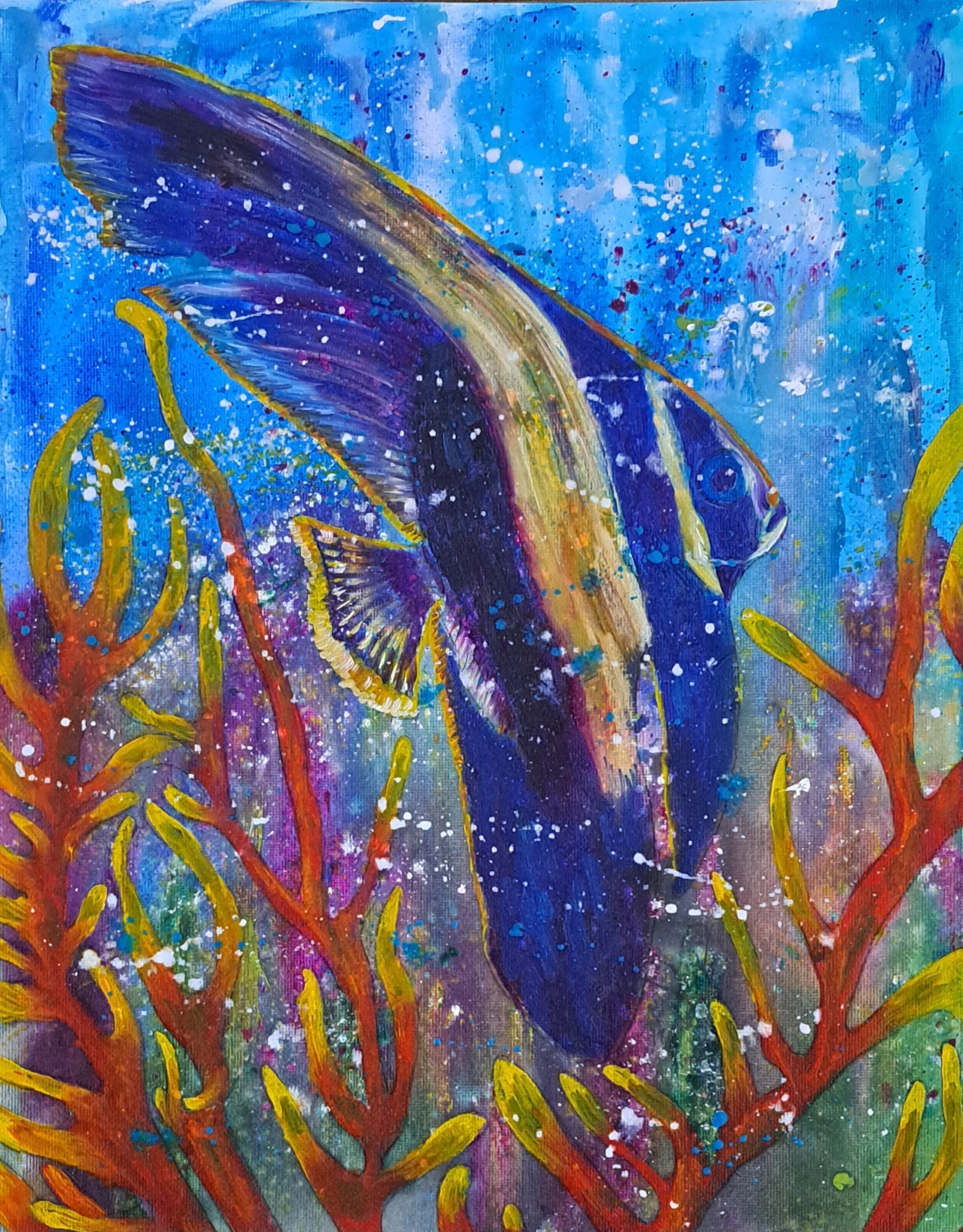 Batfish is found in the Indo-Pacific. This painting is the juvenile stage of this fish. The juvenile stage is the most stunning and only lasts a few months. With age, a grey spot appears on its side. The dorsal and anal fins lengthen and become more pointed. It is the beginning of its transformation from a black elongated juvenile to a round shaped grey adult.