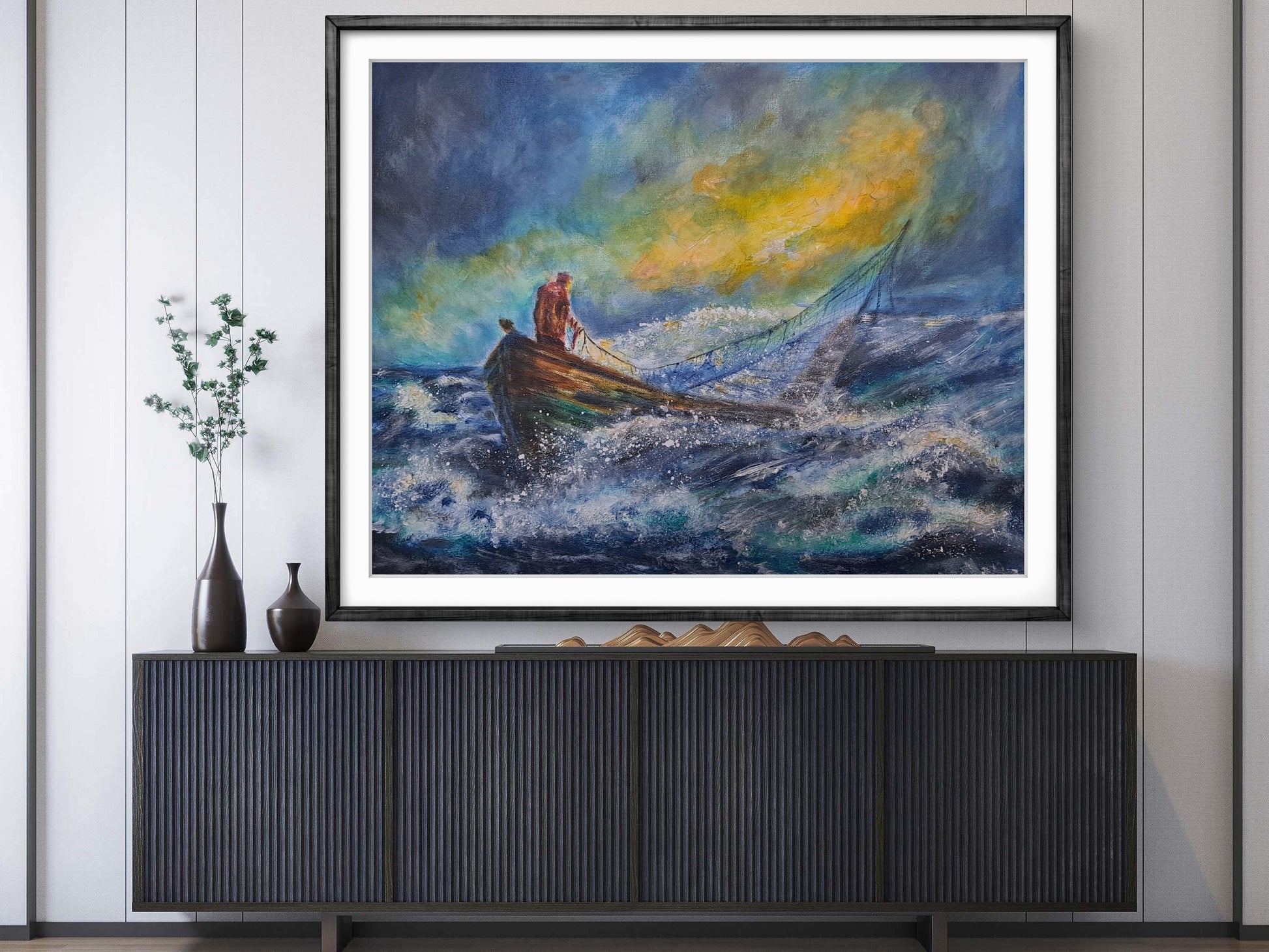 This painting is about more than a man in a boat. It's about the moment when the sky begins to turn dark, the waves rise, and you have no choice but to keep going. It's about the hands that grip the oars tighter, the eyes that scan the horizon, and the heart that refuses to give up.