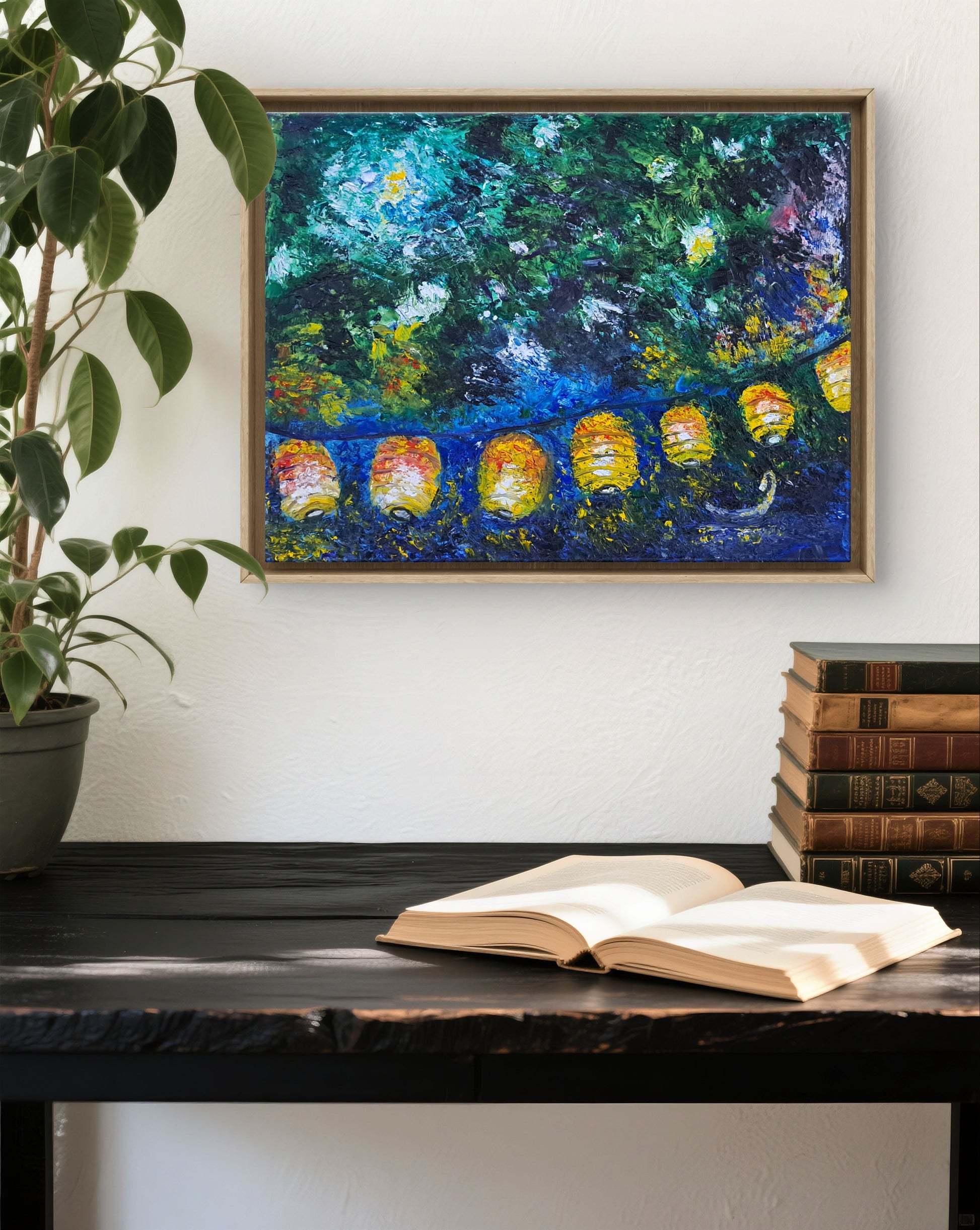 As night falls, the world softens into shadow — yet the lanterns bloom like little suns, carrying warmth into the quiet darkness. Each glow tells a story: of travelers finding their way, of wishes whispered into the night, of peace that lingers long after the day has ended. This painting captures that magical balance between darkness and light, where serenity and wonder meet.